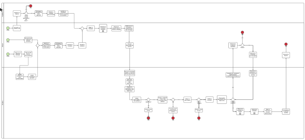 Cette représentation visuelle de ce qui se passe au quotidien permet de voir où sont les étapes redondantes et qui demandent beaucoup d’effort pour Pascale – responsable de bien suivre et colliger chaque demande d’accompagnement. On se rend aussi compte qu’on exige beaucoup d’information à des usagers qui ne se qualifient pas d’emblée au service. Comment pourrions-nous leur éviter cet effort et les informer rapidement que Justice Pro Bono n’est pas le bon véhicule pour eux?